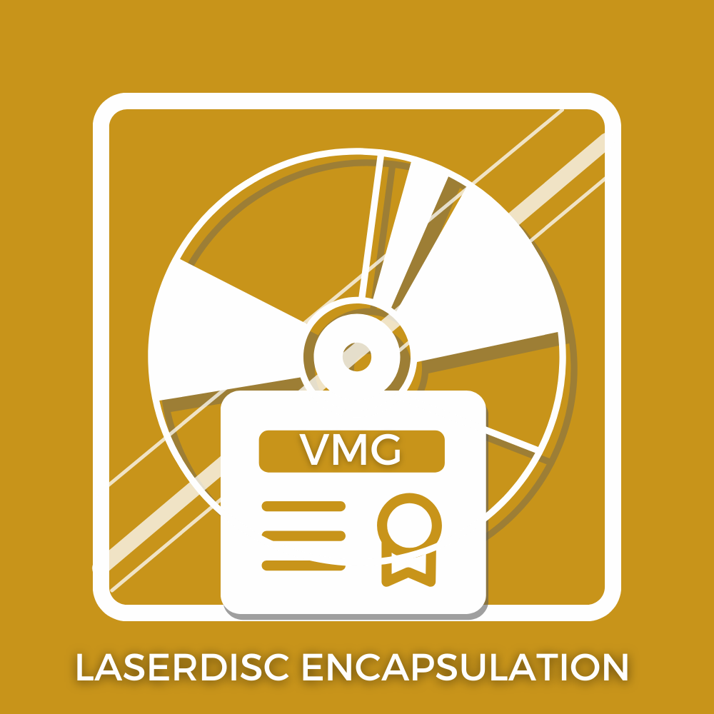 Sealed LaserDisc encapsulated in our crystal clear patented tamper-evident ultrasonically welded holder featuring our informative label and a QR code to the submission landing page displaying information specific to the submission.